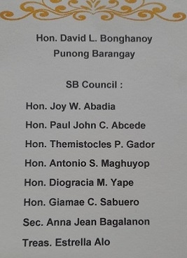 Barangay Officials as of October 30th 2023 BRGY. CAPTAIN BONGHANOY DAVID LAPUZ BRGY. COUNCILORS ABADIA JOY WAGA Maghuyop antonio signar YAPE DIOGRACIA MAAGAD PADERANGA SOTERO LUSTERO ABCEDE PAUL JOHN CLARO TOCMO NELSON PASA X SK Chairperson SABUERO GIAMAE CARANGUE BRGY. SECRETARY BAGALANON ANNA JEAN CABUNILAS Barangay Officials-Old ![]() |